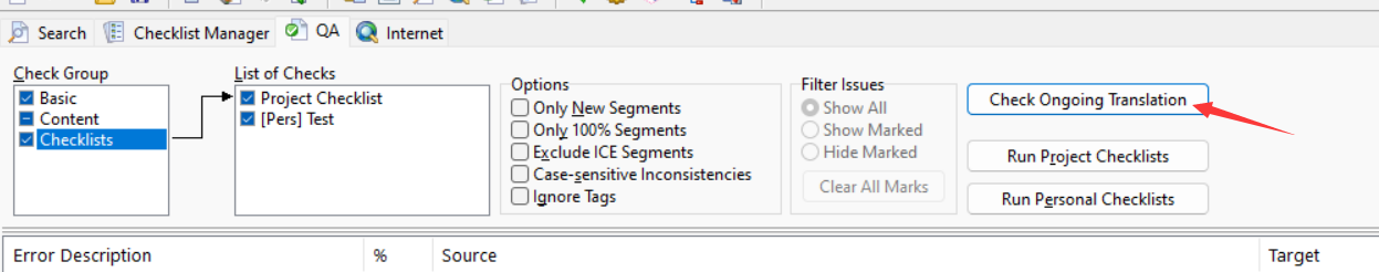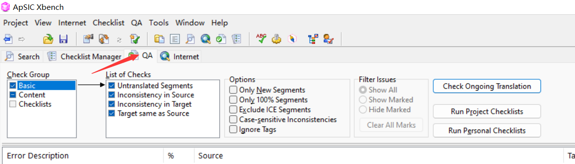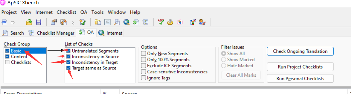 特别注意:在检查trados项目之前,确保所有句段均是已翻译、翻译被核准或已签发状态。如果没有确认句段,xbench会报出大量的未翻译句段,增加我们的QA检查时间,而且未确认句段的问题也检查不出来。