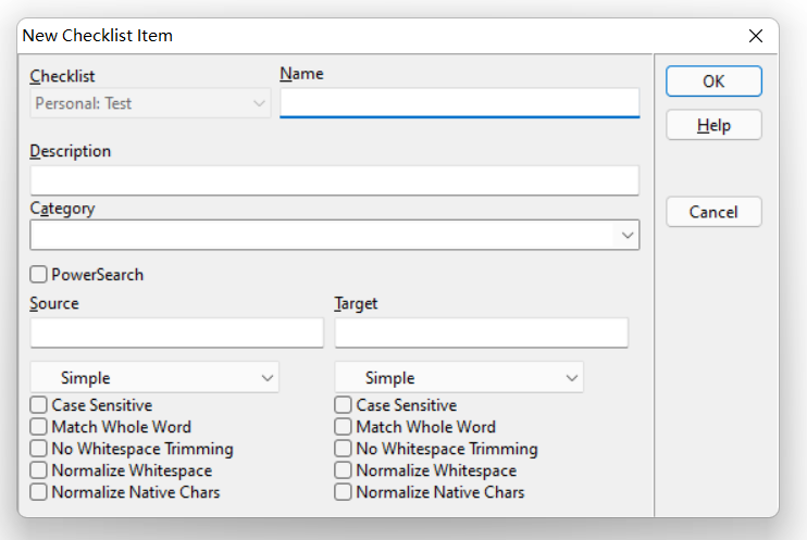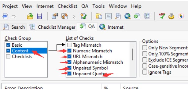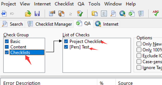 注:Content下的Tag Mismatch可以不选。Content下的选项很多,除了截图所示之外,下面还有,往下拉都选中。Checklist项下的[Pers] Test就是我们刚刚自己做的checklist。