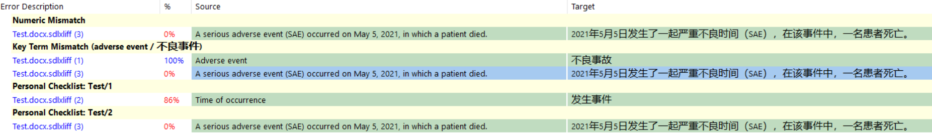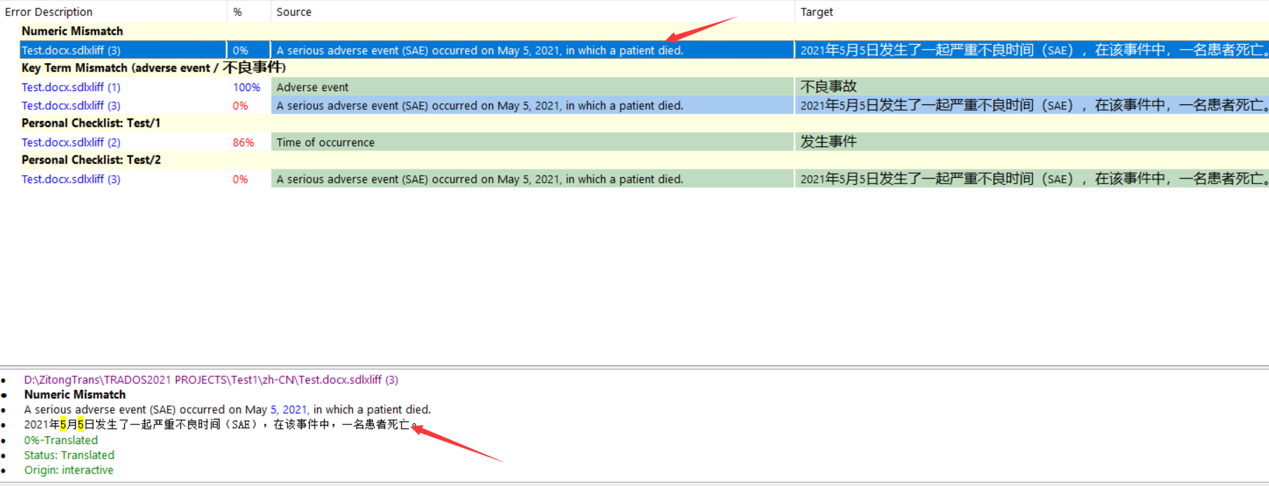 这条错误的标题是Numeric Mismatch,指数字不匹配。这里是日期翻译造成的误报,这是很正常的误报,可以不管它。这里说明了xbench可以很好地检查译文中是否有数字错误。同时注意,xbench把错误的地方都高亮显示了,方便我们找到。