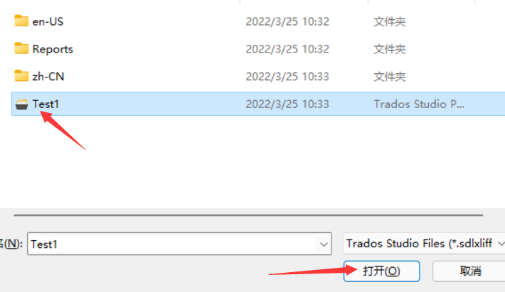 这里我已经准备好了一个test1的项目,在译文里面留了一些错误,方便演示。选中项目文件Test1,然后点击打开(如上图箭头所示),这样就添加了要检查的项目文件: