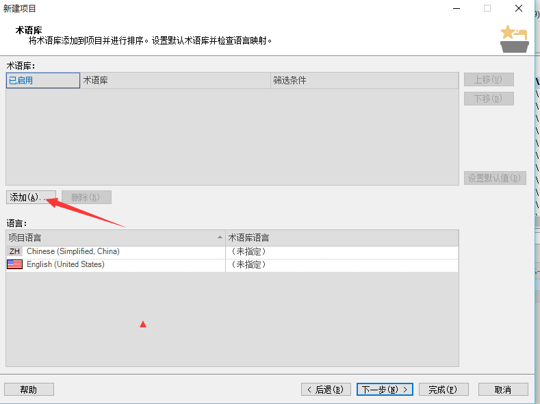 在弹出的界面上点击“浏览”,找到自己的术语库,然后点确定,接着下一步,后面的都可以不用设置了,可以直接点“完成”。项目建好后,如下图所示: