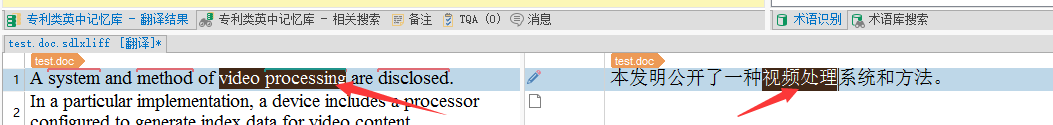 这是一篇美国某公司的公开专利文献的摘要部分,我们输入译文。第一句翻译好之后,当我们想将其中的video processing这个词定义到我们的术语库里的话,我们在原文里用鼠标选中“video processing”,再在译文里同样选中“视频处理”,如下图:
