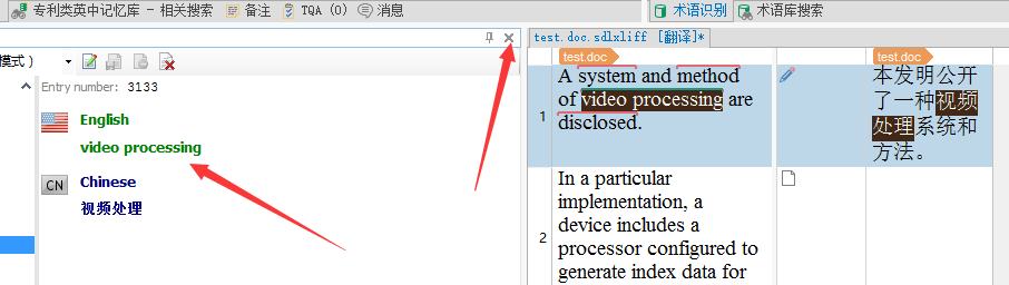术语自动保存到术语库里。然后我们点击上图箭头所示的×,返回编辑器视图。
