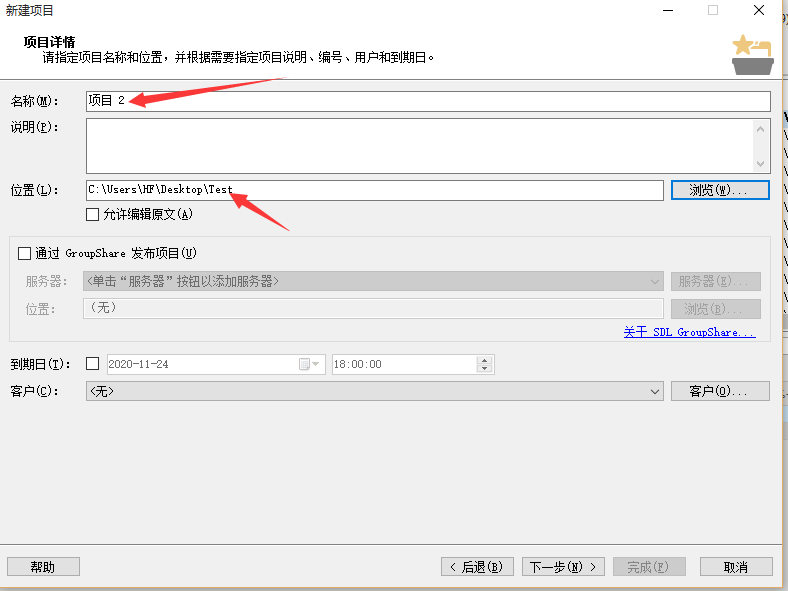 这里我们输入自己自定义的项目编号,或者客户提供的项目编号,以便以后方便查找。对于位置栏,建议选择一个固定的位置专门存放(建议不要放系统盘,以免系统出问题时,需要重装系统,造成我们存储的项目丢失)。然后点下一步,进入语言对界面: